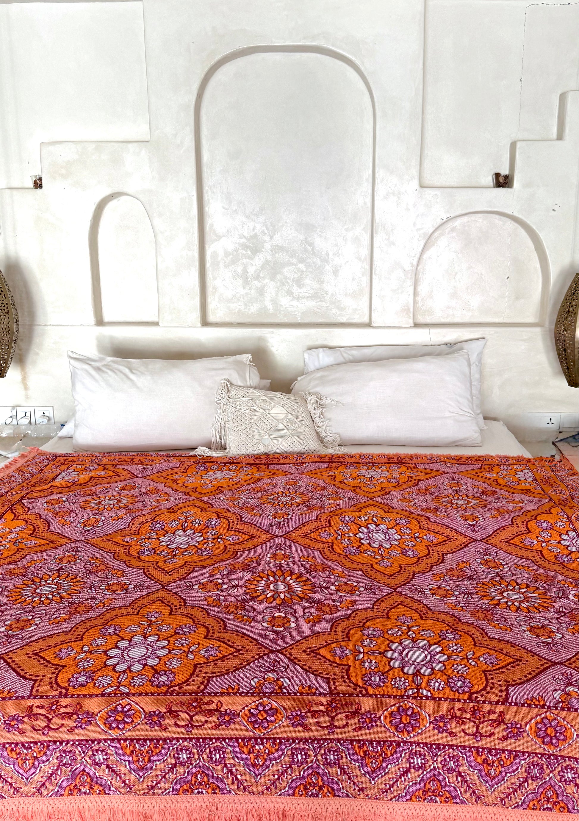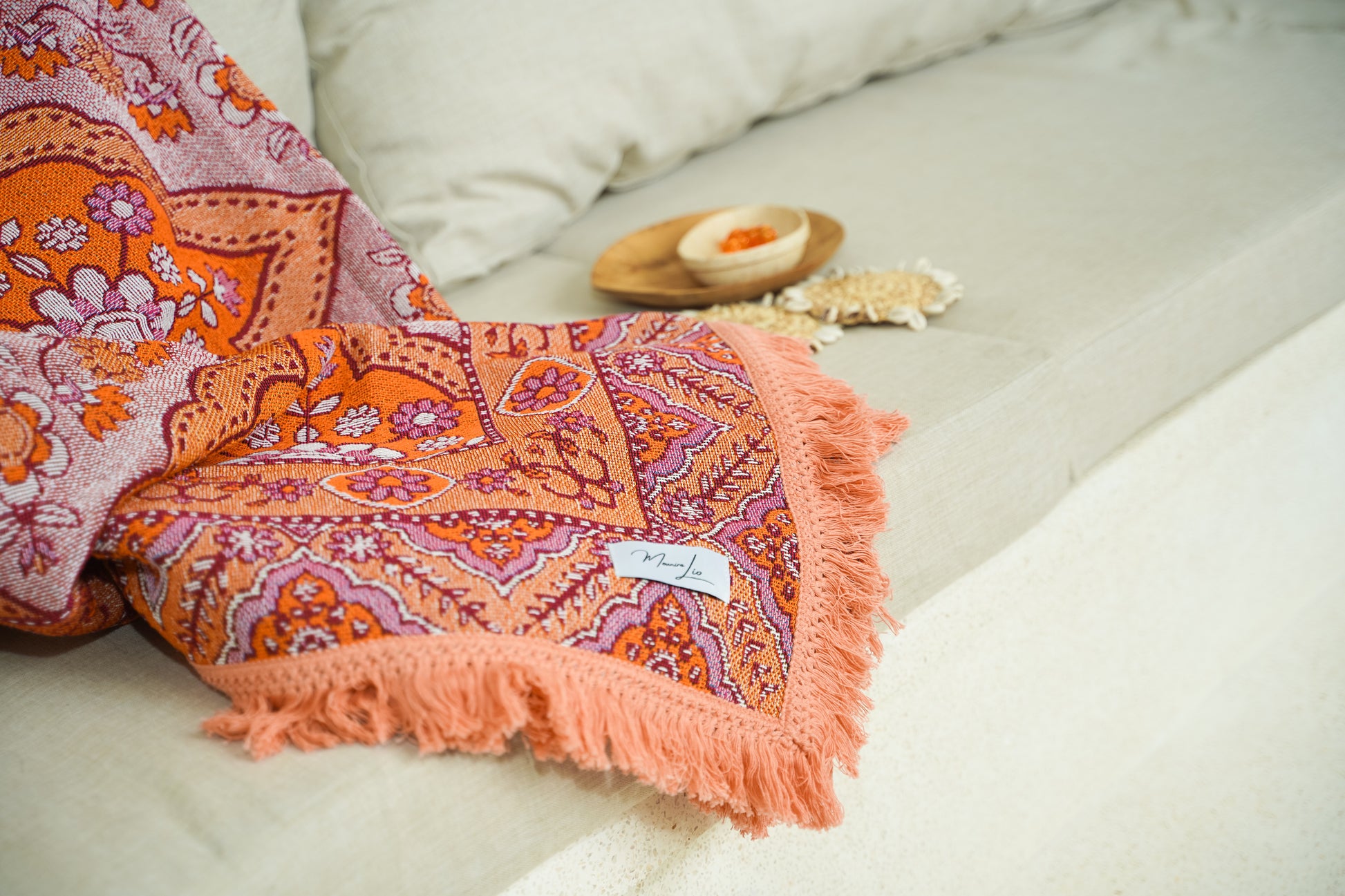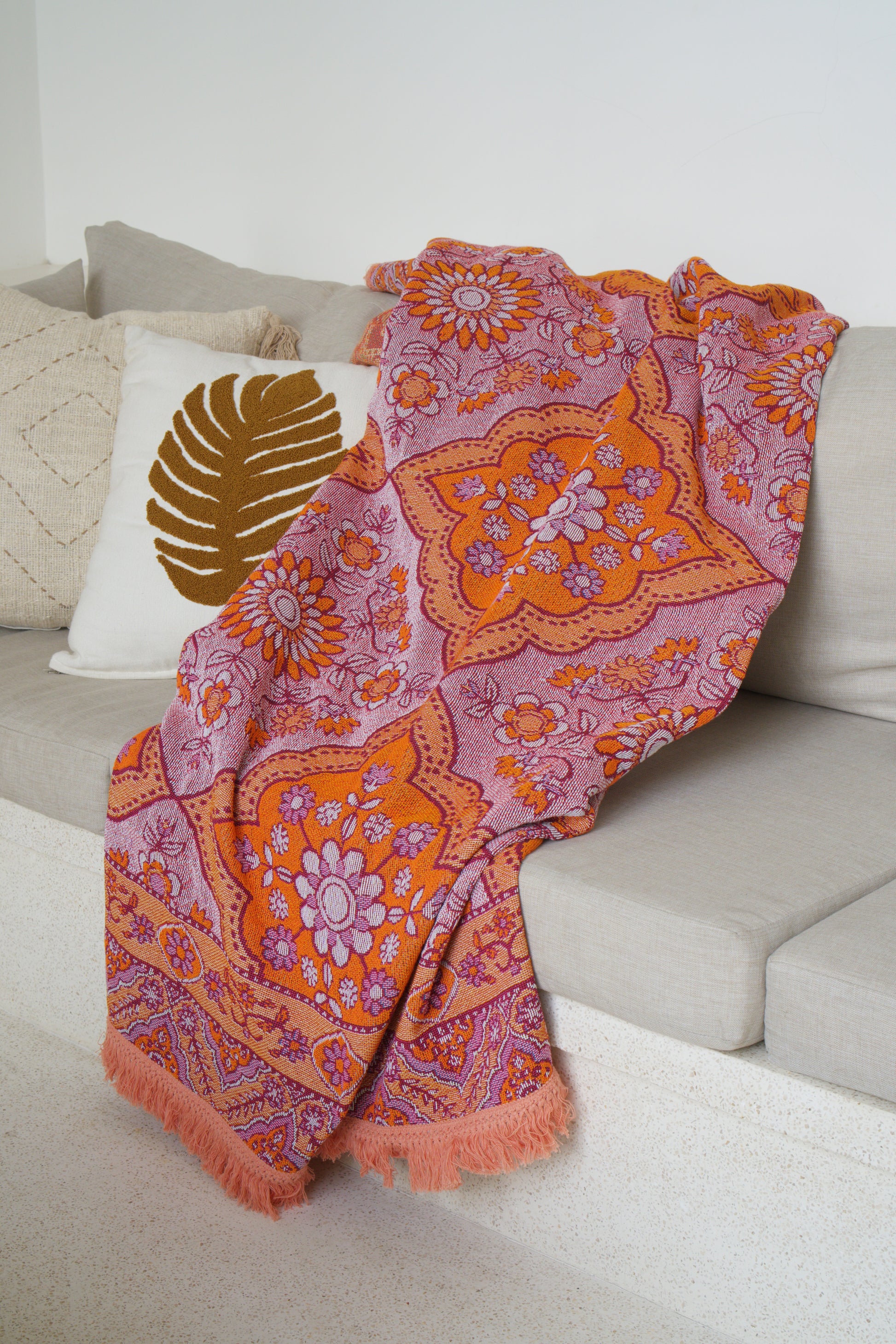 Die Sabra Decke ist ein Statement für alle, die Farbe lieben. Inspiriert von traditionellen Paisley-Elementen und sommerlichen Blüten, bringt sie Wärme, Energie und Lebensfreude in deinen Alltag – drinnen wie draußen.
