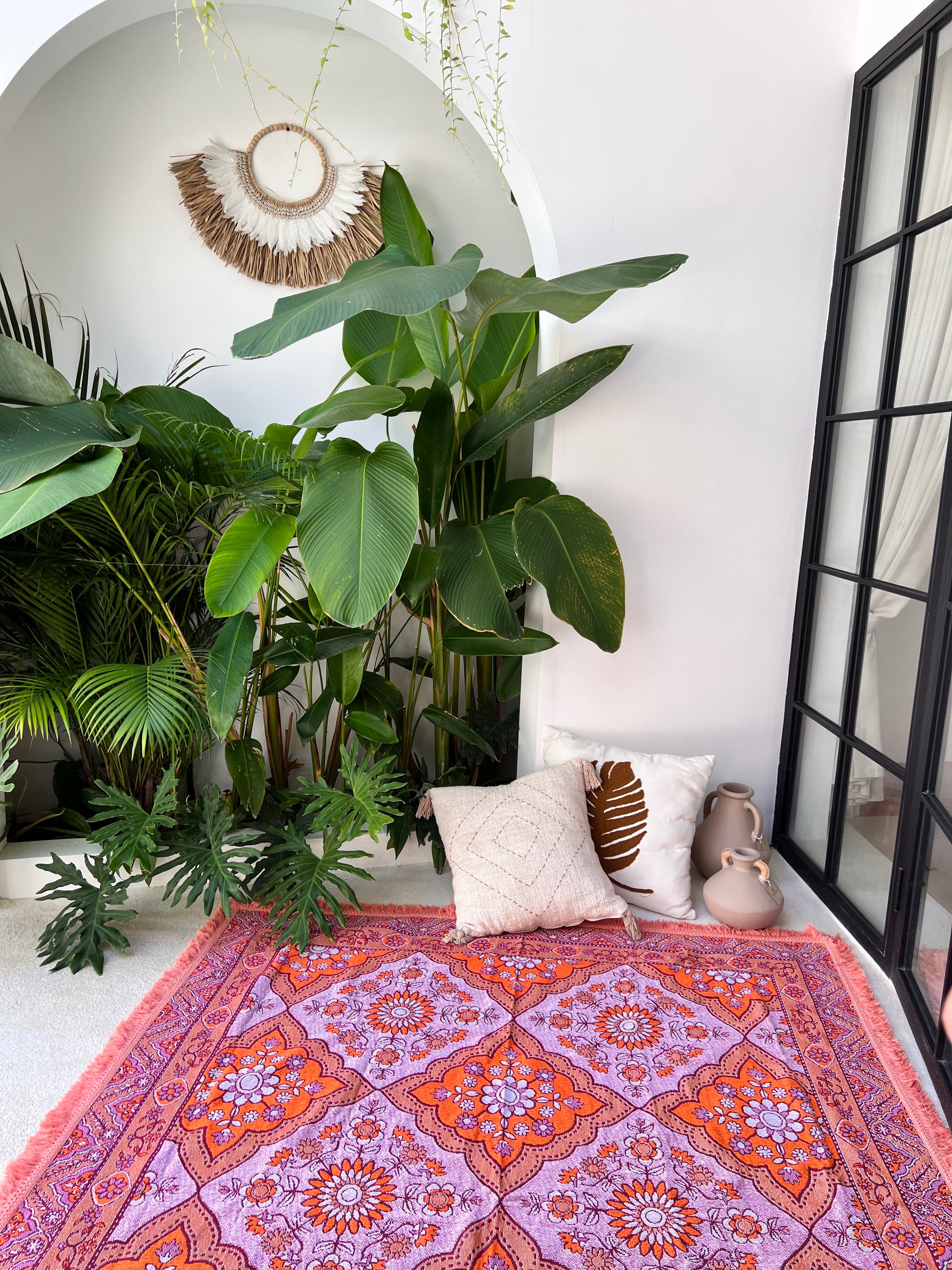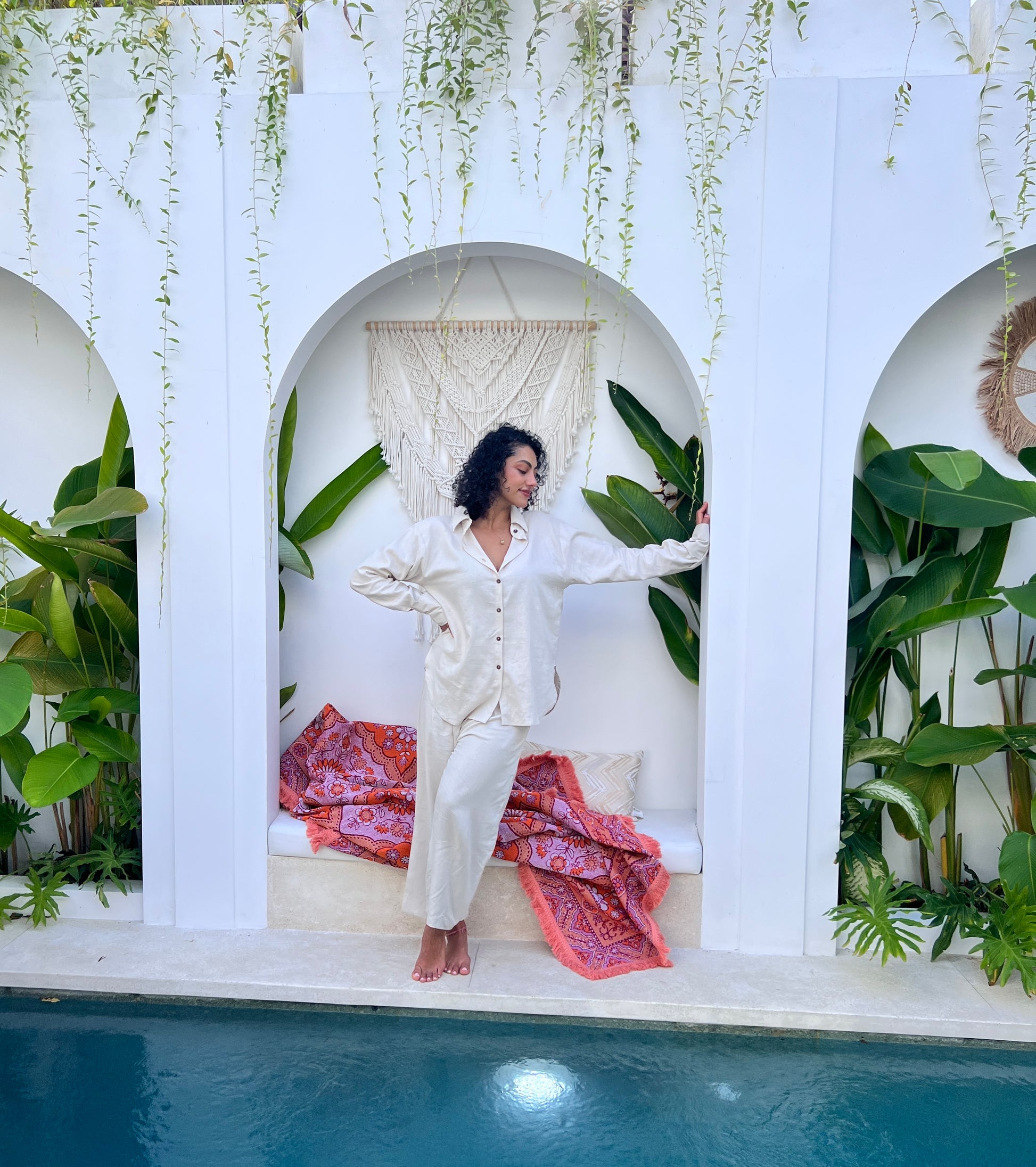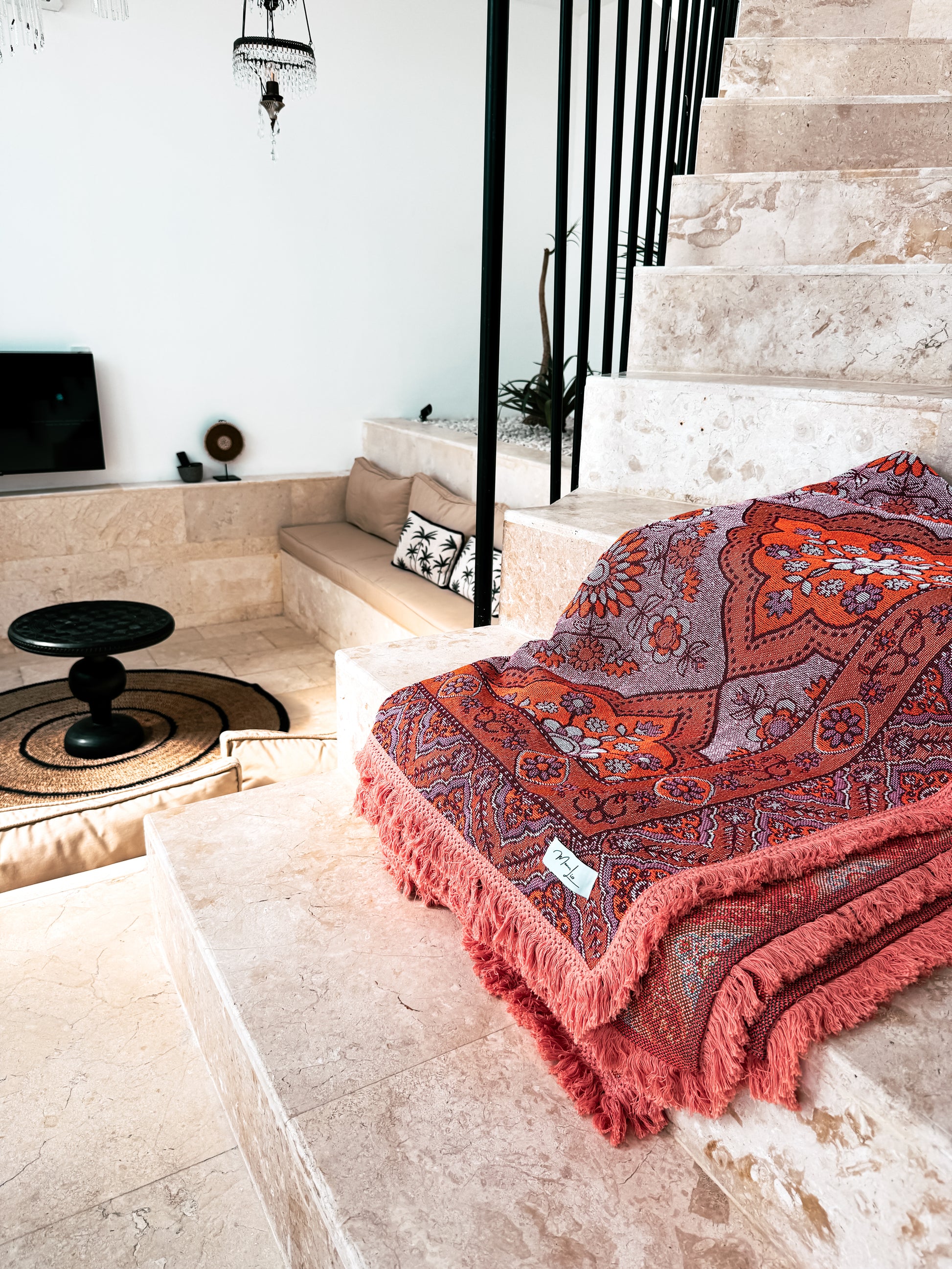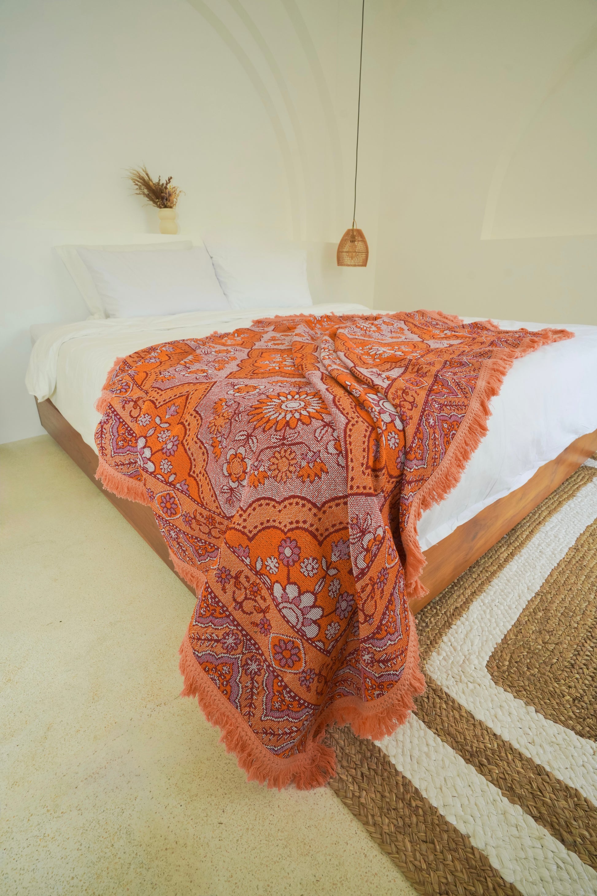 Die Sabra Decke ist ein Statement für alle, die Farbe lieben. Inspiriert von traditionellen Paisley-Elementen und sommerlichen Blüten, bringt sie Wärme, Energie und Lebensfreude in deinen Alltag – drinnen wie draußen.